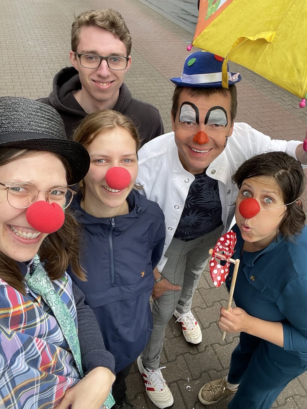 Die Ampel wird grün. „Rückenwind für Radelnde“ rufen die Clowns hinterher und blasen noch mal kräftig in das Windrad.