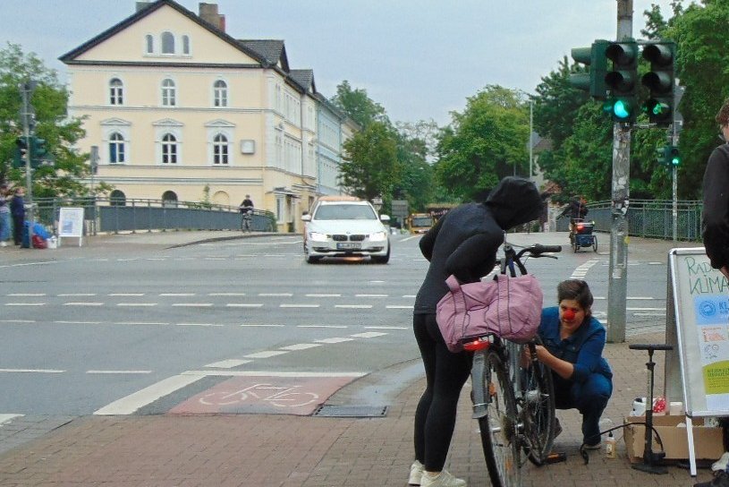 „Manche fahren jeden Tag zum Pendeln zum Bahnhof, andere machen alles autofrei, einige fahren immer mittwochs zum Markt mit dem Velo. Jeder Kilometer zählt“ sagt Lilo Fiegert vom Stadtradeln. „Ich fahre jeden Tag“ ergänzt die fesche Radlerin, „aber bedankt hat sich bei mir noch niemand.“ Neben dem kostenlosen Fahrradservice erhält sie noch eine kleine Tüte mit Informationen zum Stadtradeln, einem Klimabonus-Schein und einem Fruchtriegel zur Stärkung. Die Aktion wurde von Lünestrom, cambio Lüneburg und der De-Vau-Ge unterstützt.