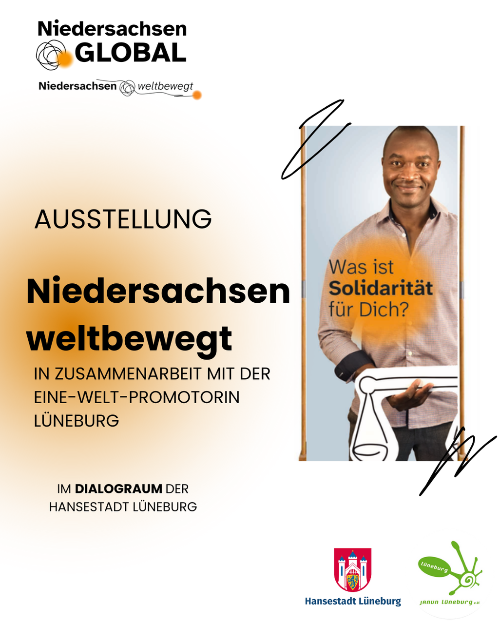 Die Ausstellung erzählt die Geschichten von vier Initiativen aus Niedersachsen, die gemeinsam mit Partner*innen weltweit für globale Gerechtigkeit aktiv sind. Themen wie Fairer Handel, Kolonialismus, Migration, Buen Vivir (Gutes Leben) und gesellschaftlicher Zusammenhalt werden dabei ganz praktisch erfahrbar. Zentrale Fragen wie „Was ist Solidarität für dich?“ oder „Welche Bewegung brauchen wir?“ regen zum Nachdenken, Austauschen und Mitreden an.