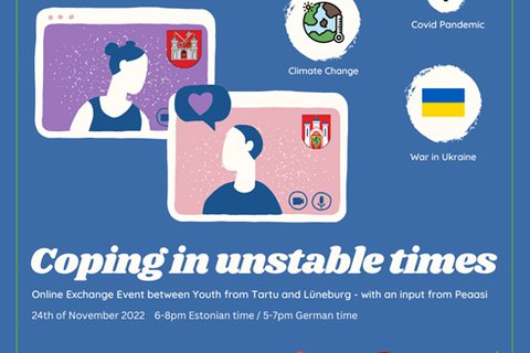 Anlässlich des Krieges in der Ukraine lädt das Quartiersmanagement Hanseviertel zusammen mit JANUN Lüneburg und dem Jugendparlament der Stadt Tartu am 24. November um 17 Uhr zu einer besonderen Online Veranstaltung: Junge Erwachsene bis 25 Jahre aus Lüneburg und Tartu sind eingeladen, sich in Kleingruppen darüber auszutauschen, wie ihnen der Alltag gelingt in diesen dynamischen Zeiten von Pandemie, Krieg und Klimawandel. Es wird auch einen kurzen Vortrag der estnischen Organisation Peaasi geben, die sich für die psychische Gesundheit von Jugendlichen und jungen Erwachsenen einsetzt. Die gesamte Veranstaltung findet auf Englisch ohne Übersetzung und mit Hilfe der Videokonferenz-Plattform Zoom statt. Bei Rückfragen meldet Euch gerne beim Quartiersmanagement Hanseviertel (max.werner@stadt.lueneburg.de , 04131-309-3344).