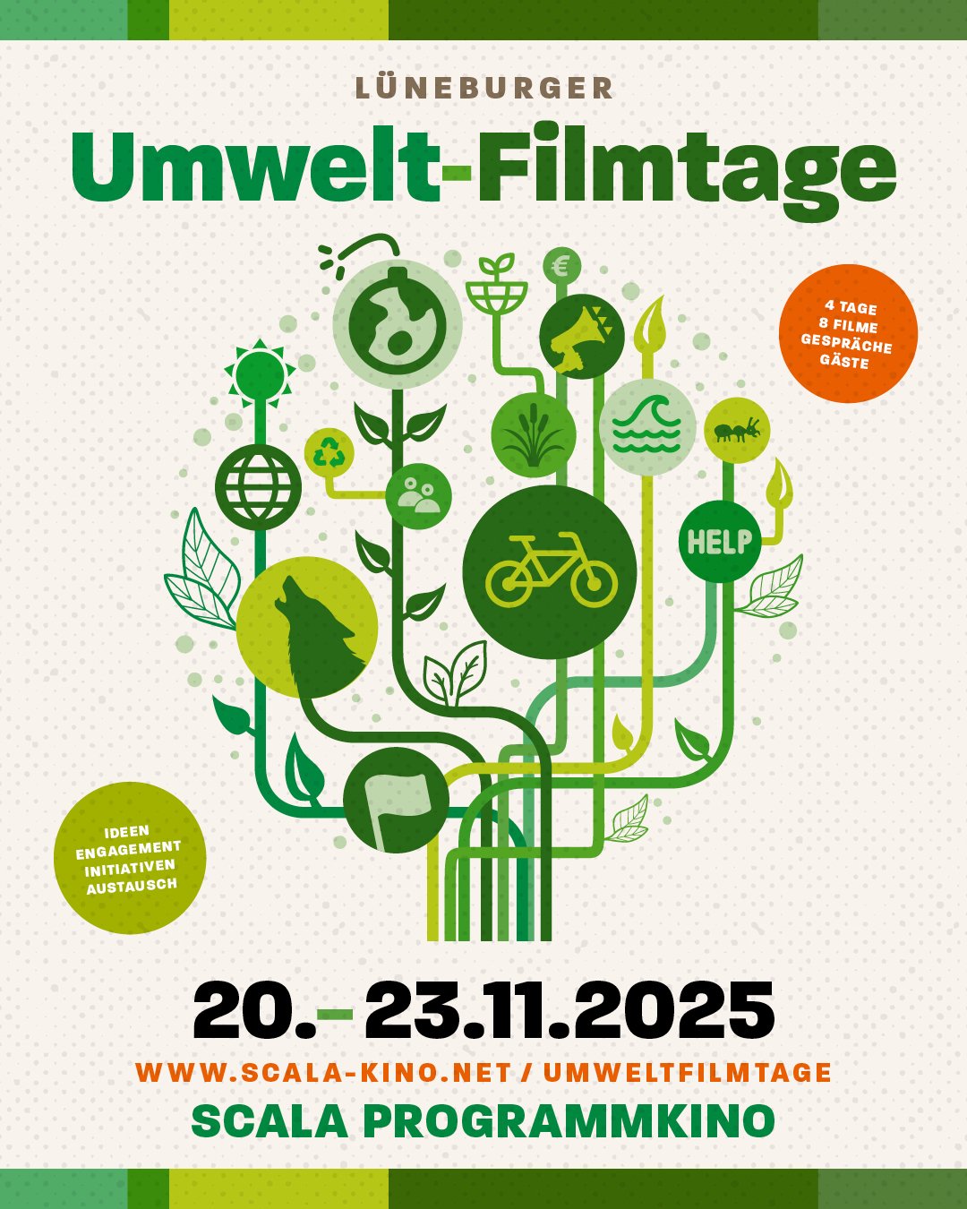 Wir sind dabei! Vier Tage mit Filmen, Gäste, Gesprächen und Begegnungen: Nachhaltigkeit in ihrer Vielfalt und im ökologischen, ökonomischen und sozialen Kontext. Alle Filme werden von lokalen Initiativen begleitet oder von ihren Filmemacher:innen vorgestellt. Mit dabei u.a. JANUN Lüneburg, das Klimakollektiv, FridaysforFuture Lüneburg, der VCD, der BUND u.v.a.